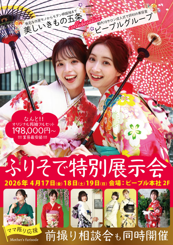 このたび、京都・室町五条にある呉服問屋 美しいきもの五条さんのお力添えをいただき、着物展示会を開催させていただく運びになりました。美しいきもの五条さんは、日本の伝統美「古典柄振袖」からモードなおしゃれ「モダン柄振袖」「キュートでかわいい振袖」などたくさん取り揃えております。是非一度足をお運びください。